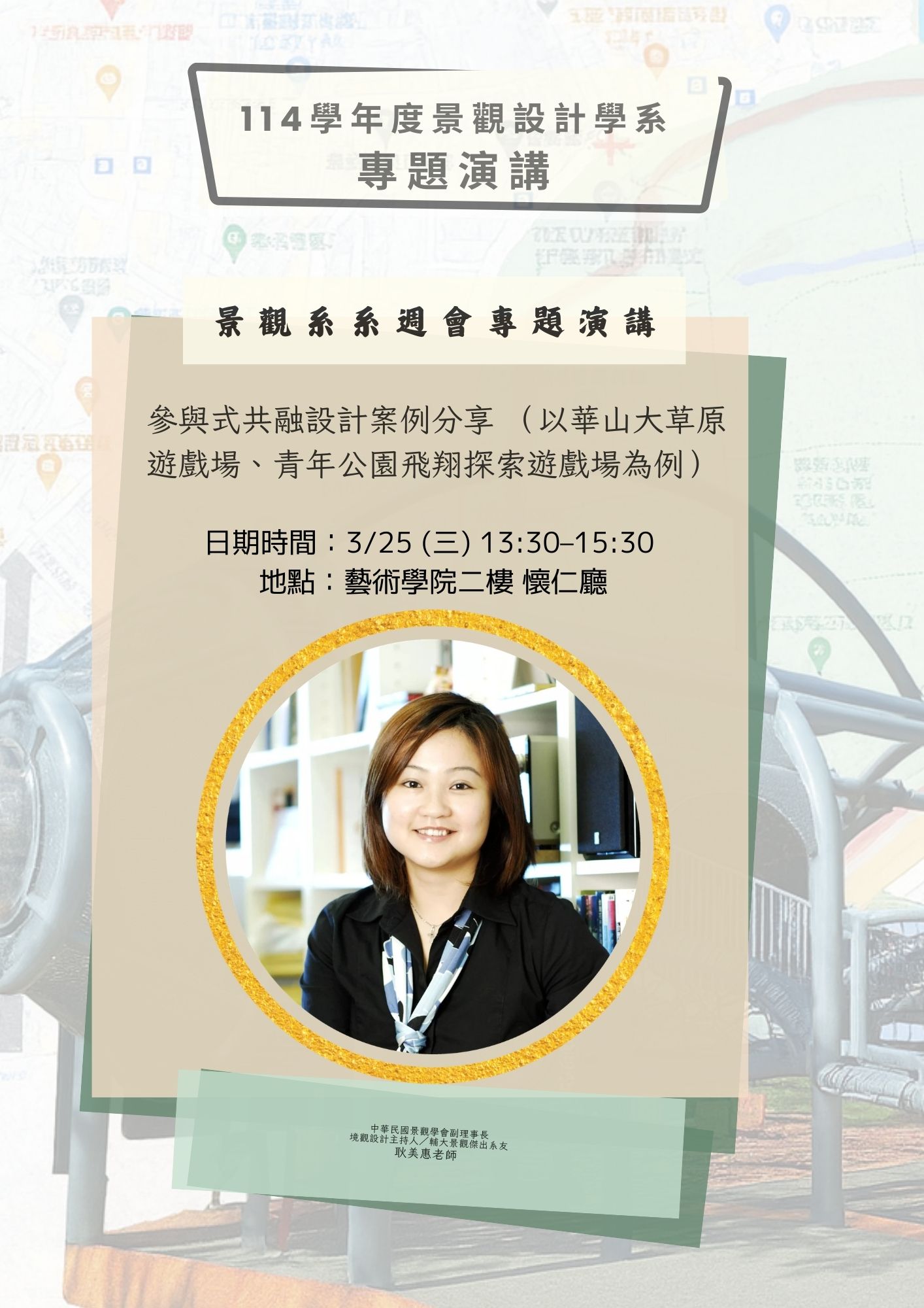 2026.3.25 景觀系系週會專題演講-參與式共融設計案例分享 (以華山大草原遊戲場、青年公園飛翔探索遊戲場為例) 演講者:耿美惠老師 中華民國景觀學會副理事長 境觀設計主持人/輔大景觀傑出系友