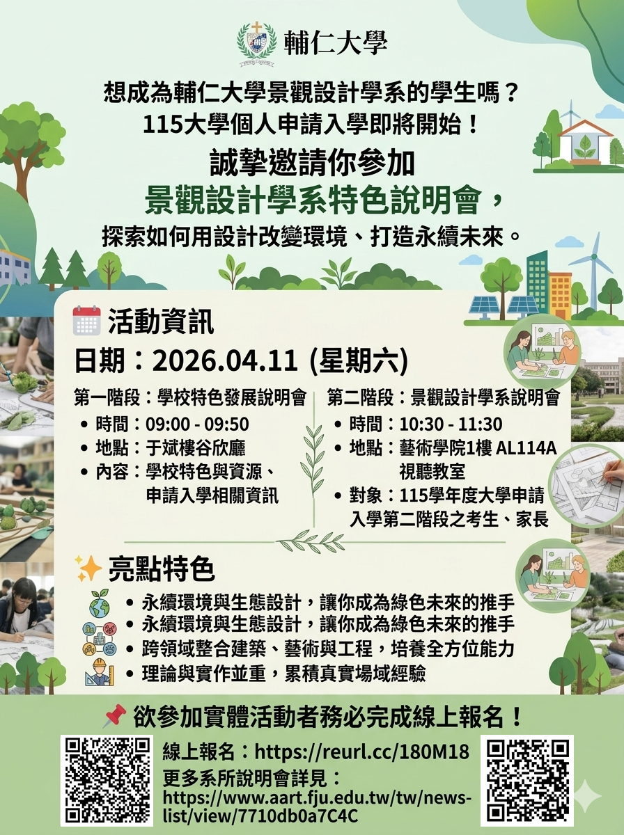 誠摯邀請你參加 輔大景觀設計學系特色說明會,探索如何用設計改變環境、打造永續未來。