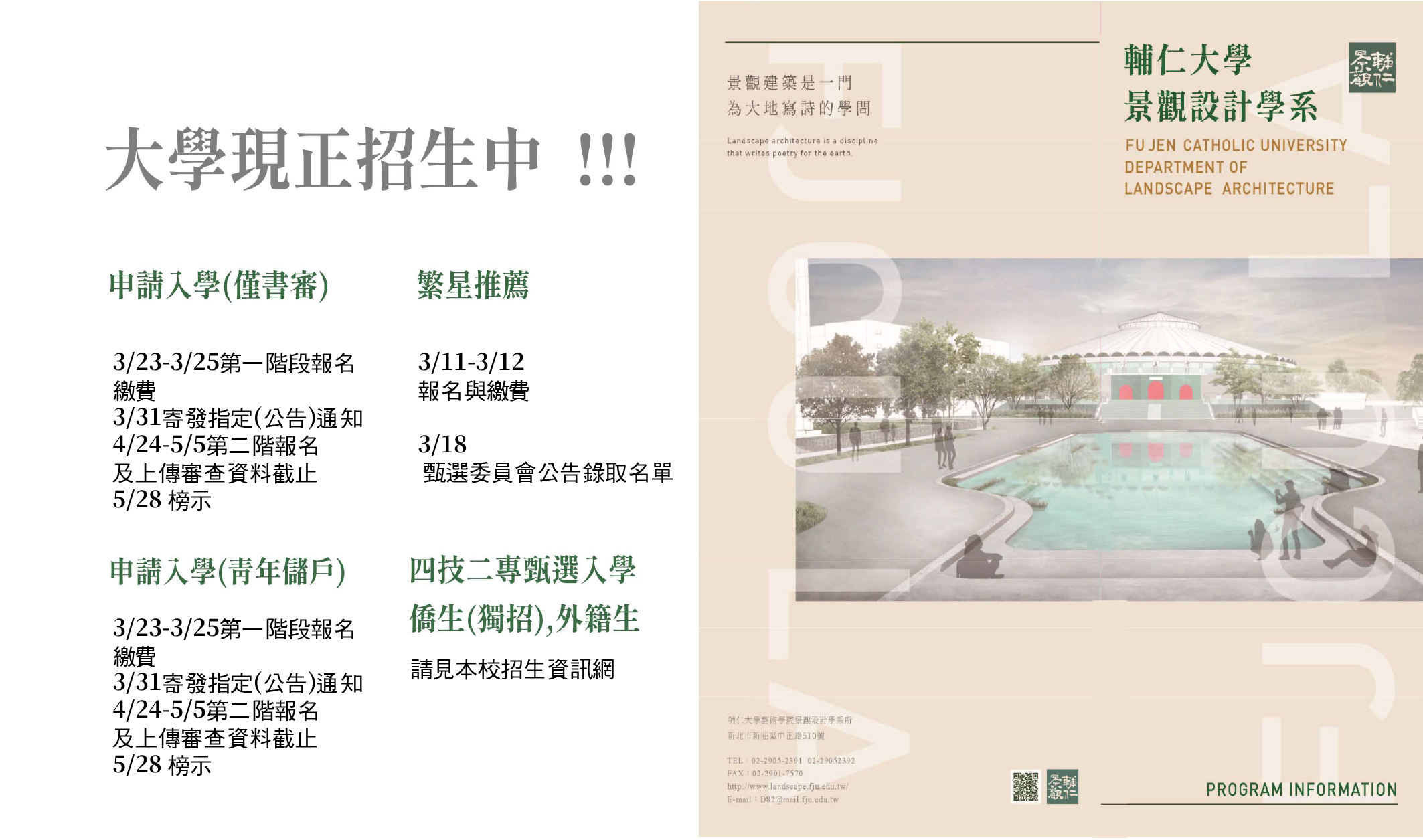 || 官網:本網頁高中生招生專區 || https://www.landscape.fju.edu.tw/zh/page/studying-hs.html