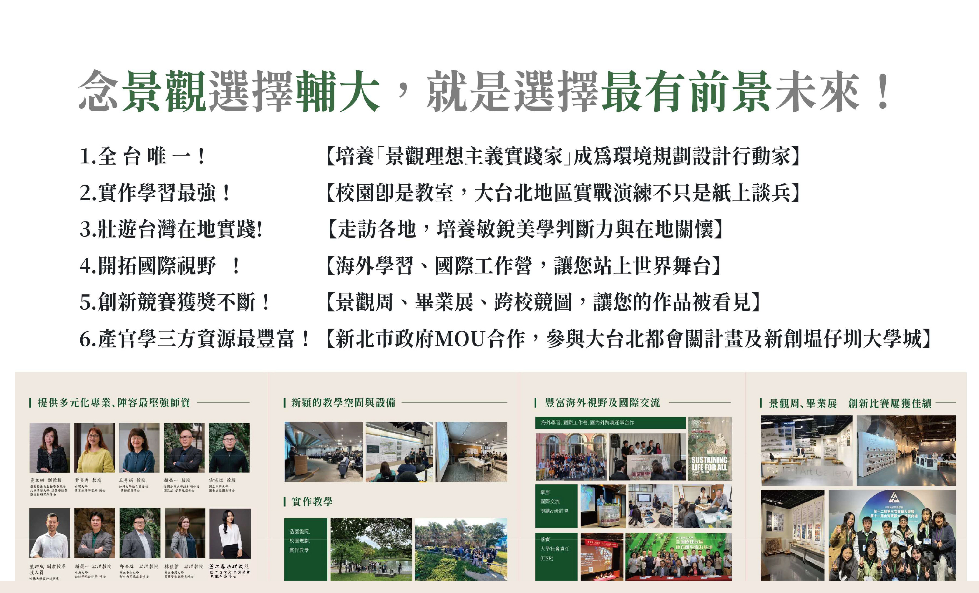 優勢1--多元豐富師資:專業涵蓋景觀設計、建築、都市規劃、園藝、藝術等領域,培養扎實專業力。